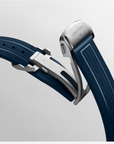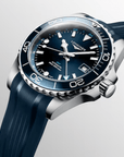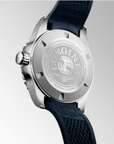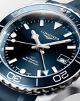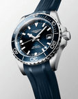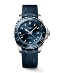 The HydroConquest GMT is also distinguished by its 41 mm-diameter stainless steel case with screw-down back and crown. This model features a new unidirectional notched bezel in blue ceramic with luminescent capsule. The dial is blue. This version comes with a stainless-steel bracelet, or a blue rubber strap.
