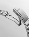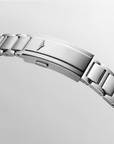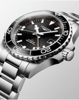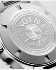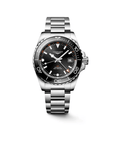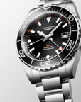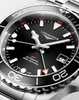 The HydroConquest GMT is also distinguished by its 41 mm-diameter stainless steel case with screw-down back and crown. This model features a new unidirectional notched bezel in black ceramic with luminescent capsule. The dial is black. This version comes with a stainless-steel bracelet, or a black rubber strap.