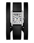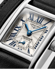 This piece now comes in black with a rectangular 21.50 mm x 29.00 mm stainless-steel case, equipped with a high-precision L178 quartz movement and is water-resistant to 3 bar (30 metres). This model with a silvered flinqué Roman dial with painted Roman numerals comes with an elegant double tour strap in black Nappa leather with a steel tongue buckle.