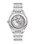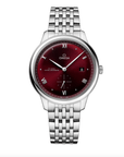 In this 41 mm stainless steel model, the domed PVD wine-burgundy dial features a sun-brushed finish. The display is distinguished by rhodium-plated hands, as well as alternating Roman numerals and cabochon indexes.