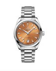 The saffron dial, fashioned from brass, is lacquered and sun-brushed from the centre. There is a date window at 6 o'clock and rhodium-plated hands and indexes filled with white Super-LumiNova.