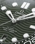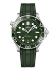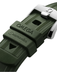 The watch is presented on a green rubber strap and is driven by the OMEGA Master Chronometer Calibre 8800, which can be seen through the sapphire-crystal on the wave-edged caseback.