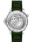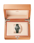 This 42 mm model is crafted from stainless steel and includes a green ceramic bezel with a white enamel diving scale. The dial is also polished green ceramic and features laser-engraved waves and a date window at 6 o’clock.