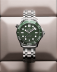 This 42 mm model is crafted from stainless steel and includes a green ceramic bezel with a white enamel diving scale. The dial is also polished green ceramic and features laser-engraved waves and a date window at 6 o’clock.