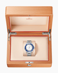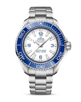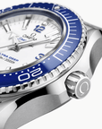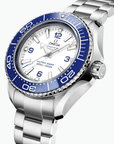 This 45.5 mm model in robust O-MEGASTEEL features a polished blue ceramic bezel with its diving scale in white enamel. Through the protuberant and domed sapphire crystal, the lacquered white dial has been given four Arabic numerals in blue, as well as 18K white gold hands and hour markers, which are all coated with white Super-LumiNova.