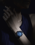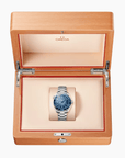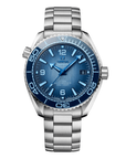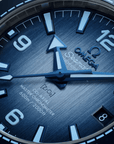 The vertical brushed ceramic dial in OMEGA’s own Summer Blue is PVD treated and varnished with a gradient finish to reflect the watch’s level of water resistance. A blue ceramic bezel with light blue diving scale encircles the bold display, which includes blued hands and indexes filled with a unique light blue Super-LumiNova.