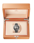 The dial is presented with a sand-blasted “gunmetal” grey galvanic treatment and includes a date window at 6 o’clock, sandblasted stainless steel subdials, along with transferred words in beige and white. The OMEGA logo, Arabic numerals, hands, and hour markers are all in PVD stainless steel with a brushed finish, while the beige Super-LumiNova improves visibility in dark conditions.