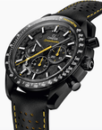 Presented on a perforated black leather strap with a yellow rubber interior, the entire watch is black ceramic and includes varnished yellow chronograph hands and a Super-LumiNova tachymeter scale.