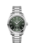 The sun-brushed dark green dial is distinguished by a date window at 6H and a Small Seconds subdial featuring an 18K white gold ring. The design is further complemented by rhodium-plated hands filled with white Super-LumiNova, as well as 18K white gold indexes that are shaped like sailboat hulls, with an iridescent mother-of-pearl inlay.