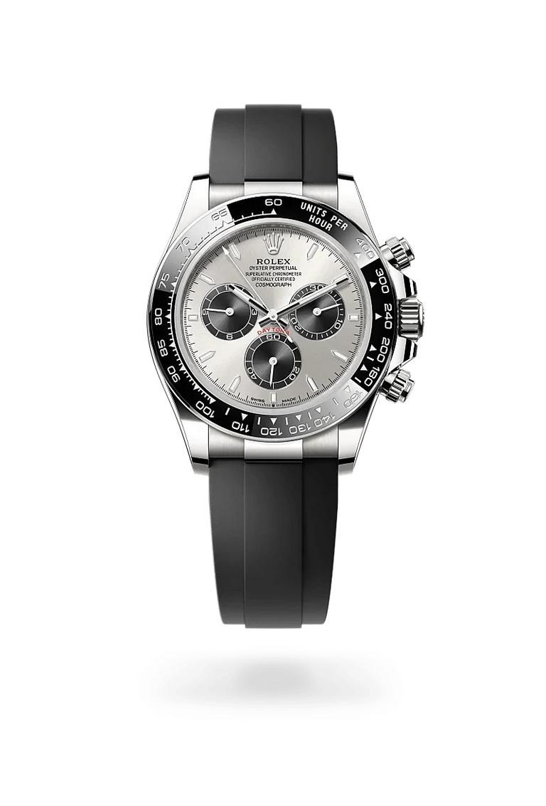The 18 ct gold versions of the Cosmograph Daytona featuring a Cerachrom bezel are exclusively available with an Oysterflex bracelet. Developed by Rolex and patented, it singularly combines the robustness of a metal bracelet with the comfort of an elastomer bracelet. Equipped with an Oysterlock safety clasp, which prevents accidental opening, its length may be adjusted via the ingenious Rolex Glidelock extension system.