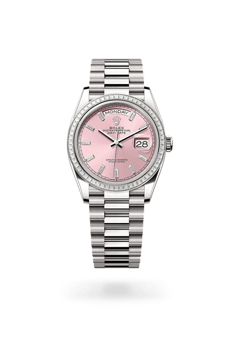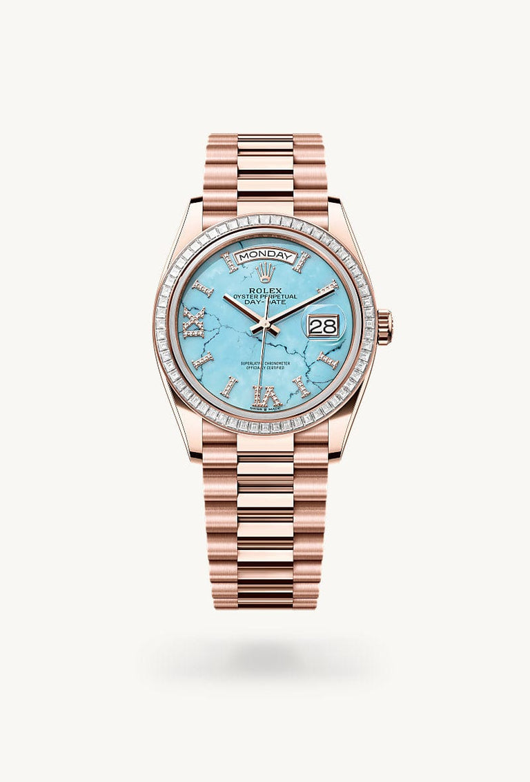 At its launch in 1956, the Day-Date was a major innovation: it was the first calendar wristwatch to indicate, in addition to the date, the day of the week spelt out in full in an arc-shaped window at 12 o’clock on the dial – a technical feat at the time. Made exclusively of precious metals – 18 ct yellow, white or Everose gold or 950 platinum – and accompanied by its emblematic President bracelet, its multiple dials make it the ideal canvas for self-expression.