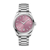 The shell pink dial, fashioned from brass, is lacquered and sun-brushed from the centre. There is a date window at 6 o'clock and rhodium-plated hands and indexes filled with white Super-LumiNova.
